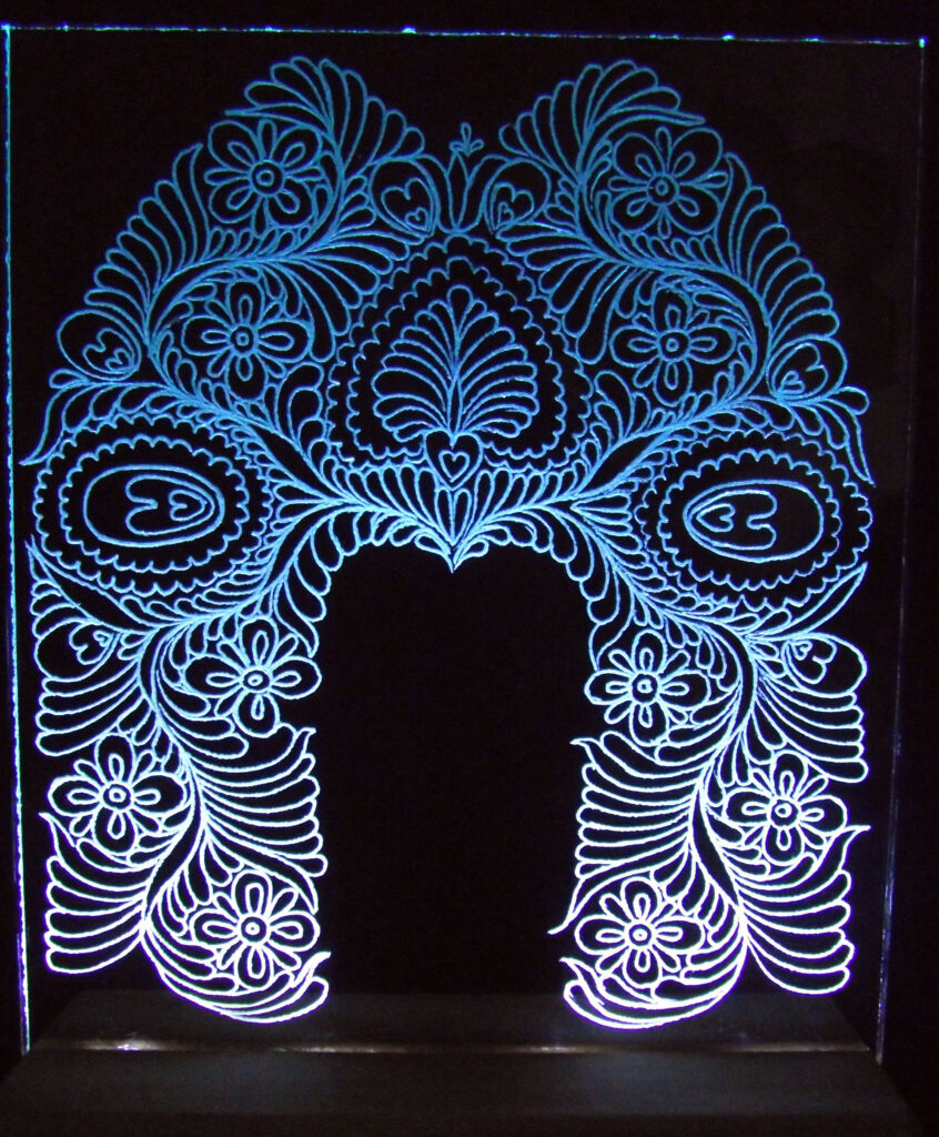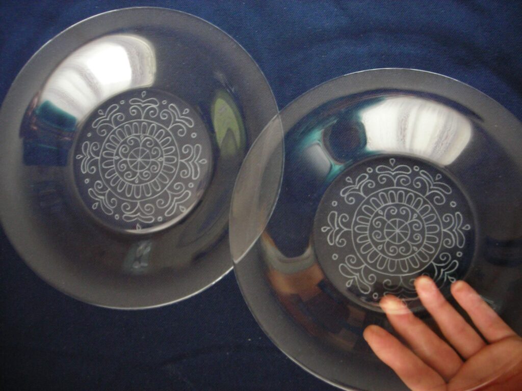Üveg tányérok gravírozva, mintája: kalotaszegi, rozmaringos napkorong.