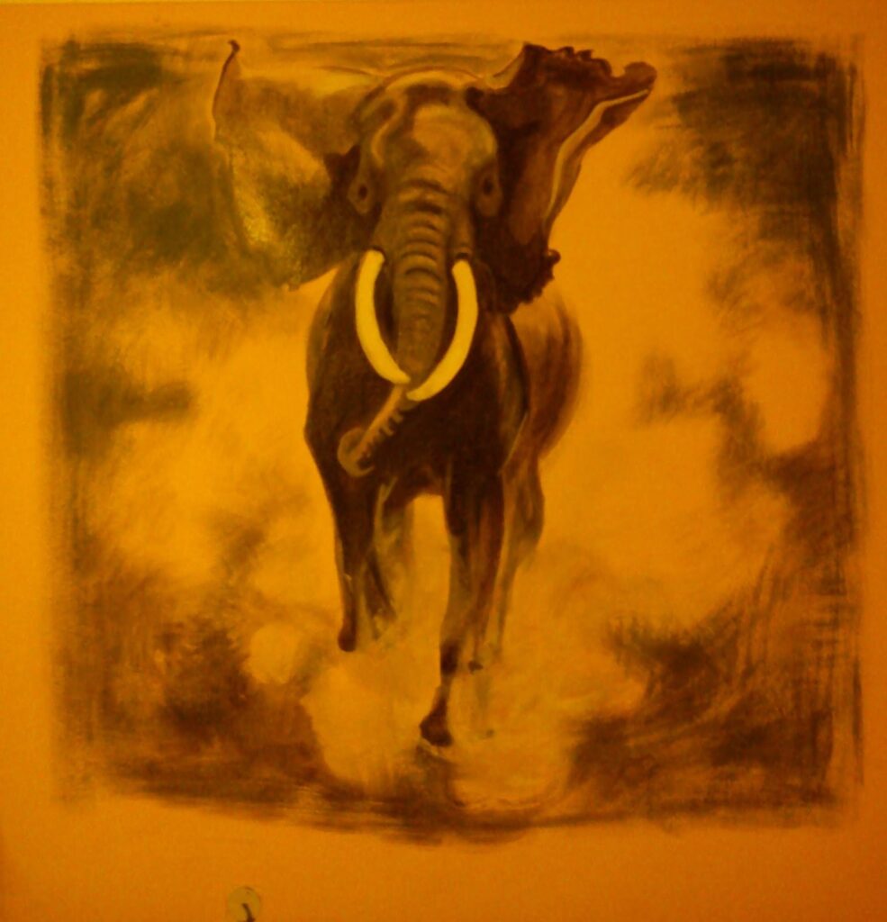 Egy sárga falra készült elefántos festmény 190*190 cm-es méretben.
