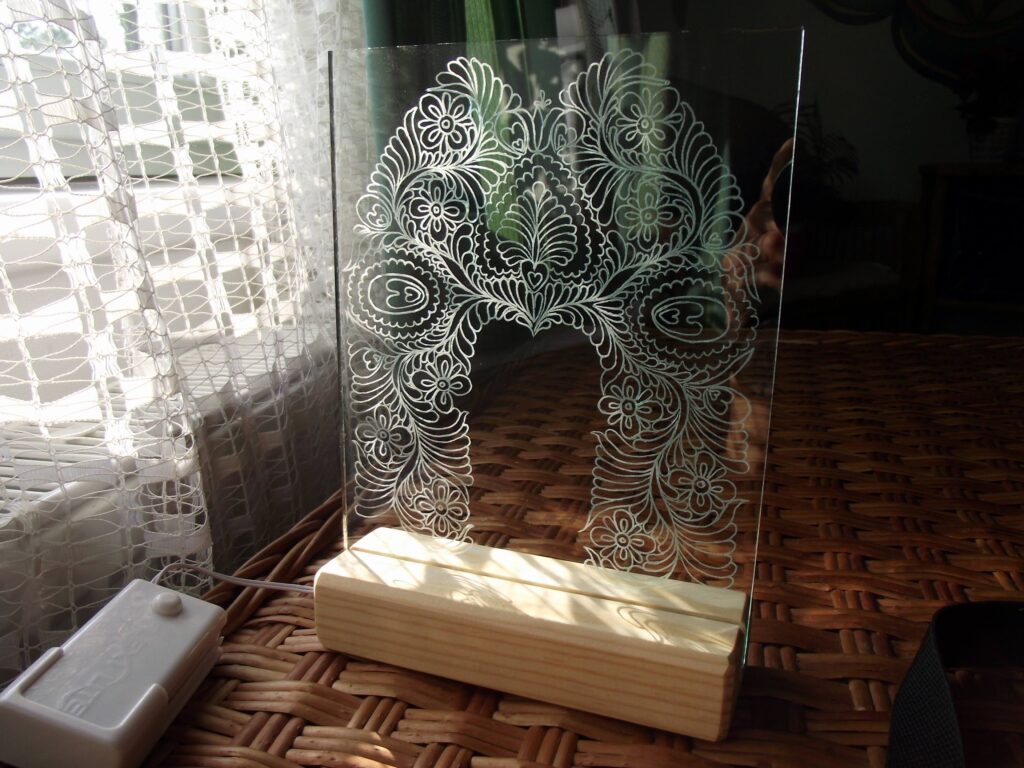Gravírozott üvegeket készítek fa talapzaton, LED világítással. Bármilyen egyedi tartalommal, felirattal kérhető. Mérete: 15*20 cm